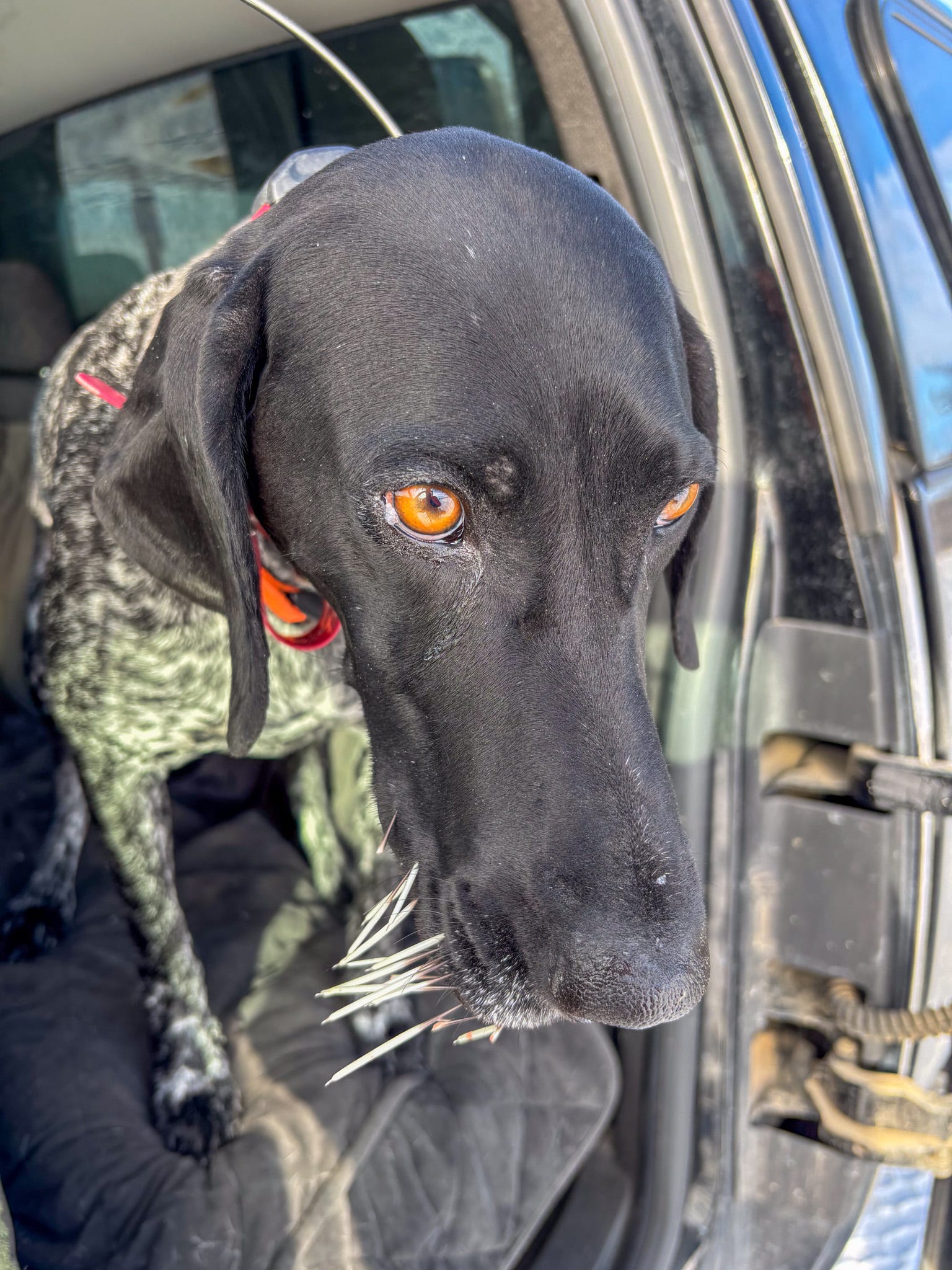 “I bet it did,” I said while examining Maggie and felt a broken off quill in her muzzle that I could barely see. The front section of quills are black and blend in perfectly with GSP muzzle hair. “Here it is.”