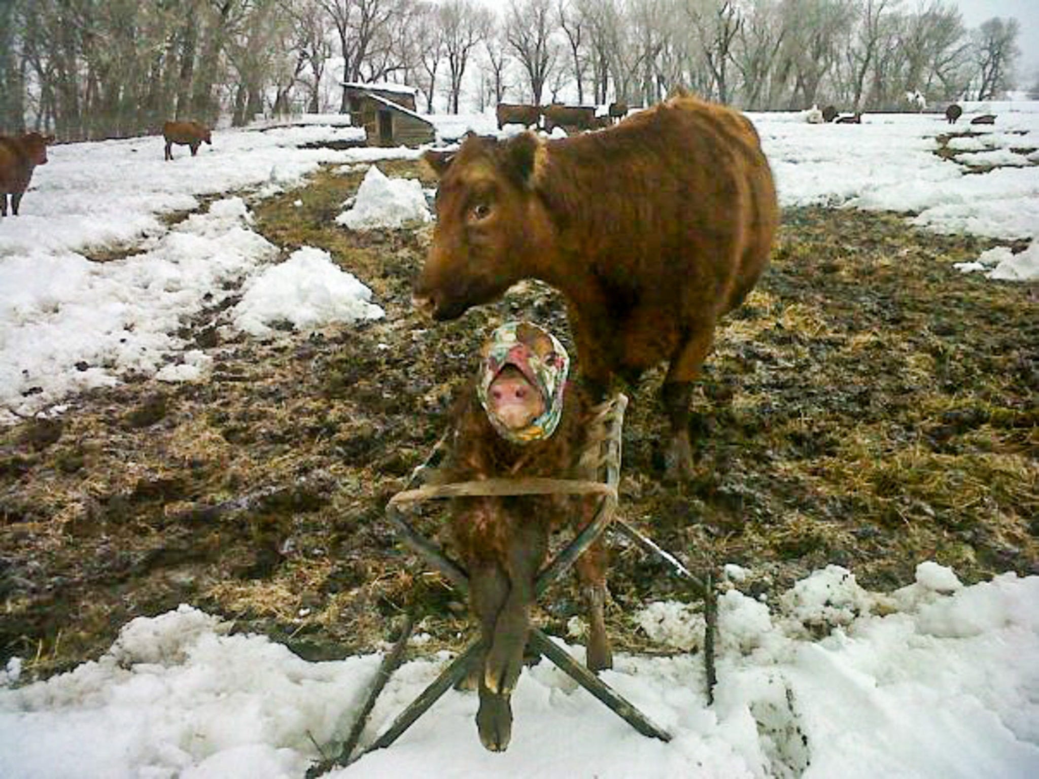 Under normal circumstances, meaning temps above ten degrees or so, we had little hats we could slide over the calves’ nose and pin their ears back to keep them from freezing. Then you put them on a sled and drag them to the barn. Hopefully mom was following you and you could plop them in a stall full of straw. Mom licks them dry which also gets their circulation going in their extremities. Then they learn to stand and suck colostrum from their mother and everyone is happy. But the barn wasn’t heated or insulated and most of the walls had cracks you could see through. If it was -30 outside, it was -30 inside.