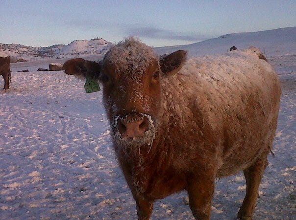 Cattle waterers froze despite the internal heaters. I chopped holes in the ice at the creek morning, noon, and night so the cows could drink. It was so cold it hurt to breath and your nostril hairs froze together. I wore my neck gaiter over my nose the entire time I was outside, and it turned to ice from my breath. The cows would huddle together for warmth, but their breath would condense on each other’s bodies to form icicles. They would clink together when they walked anywhere so the kids started calling them cowsicles. To make matters worse, we were calving.